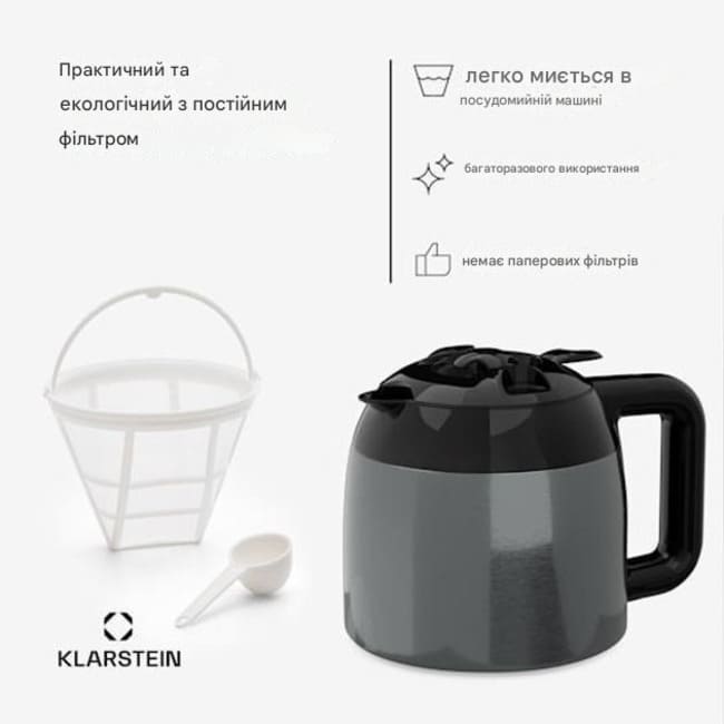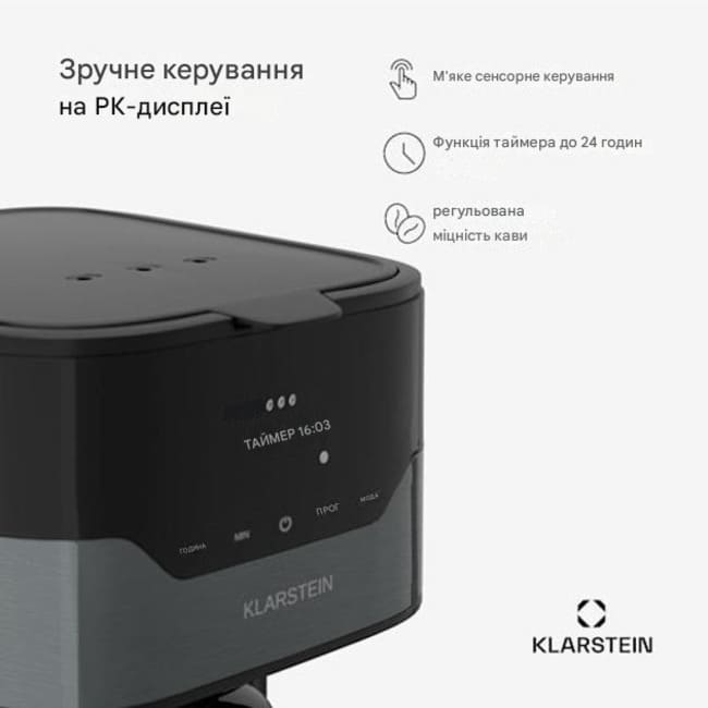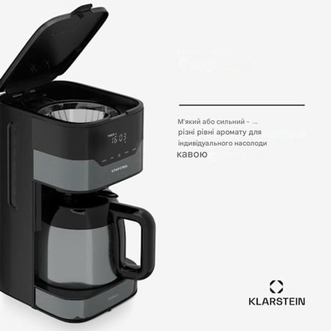 Кавоварка оснащена РК-дисплеєм та програмованим таймером. Просто встановіть час за допомогою сенсорного екрана. Функція автоматичного відключення відключає кавоварку після того, як кава готова. Кавоварка оснащена термосом з нержавіючої сталі, тому ваша кава залишається гарячою.