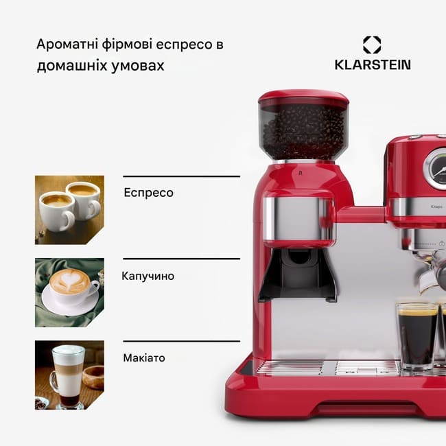 Відчуйте задоволення від якості бариста у власному домі! Придбайте еспресо-машину Klarstein Bella Café та насолоджуйтесь ароматними кавовими спеціями одним натисканням кнопки.
