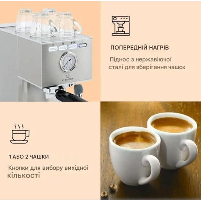 Найпрекрасніший перепочинок дня: високоякісною та ароматною кавою еспресо-машина Pausa від Klarstein збагатить ваші щоденні моменти відпочинку. Відчуйте спокусливий аромат, адже компактна портафільтрова кавомашина розкриває повний аромат кави під тиском 20 бар. Еспресо-машина підходить як для меленої кави, так і для кавових капсул.