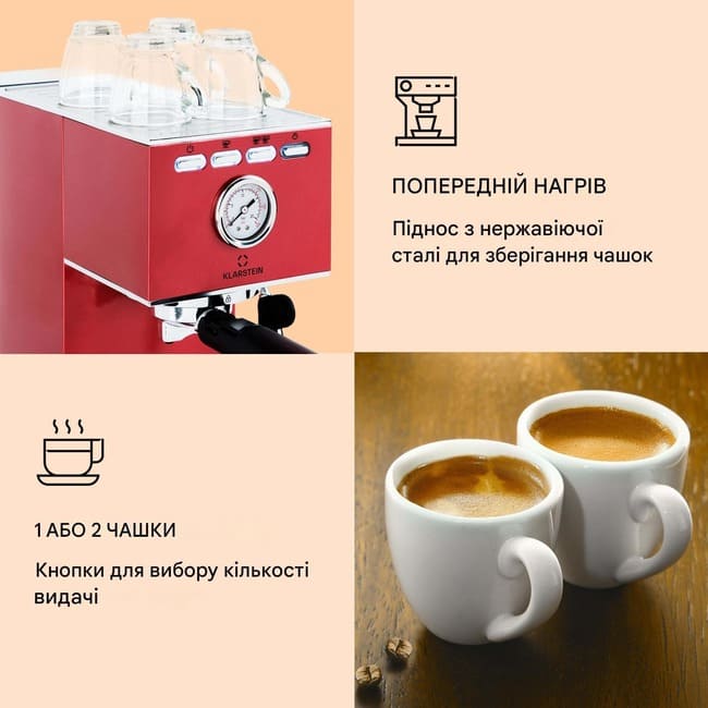 Найпрекрасніший перепочинок дня: високоякісною та ароматною кавою еспресо-машина Pausa від Klarstein збагатить ваші щоденні моменти відпочинку. Відчуйте спокусливий аромат, адже компактна портафільтрова кавомашина розкриває повний аромат кави під тиском 20 бар. Еспресо-машина підходить як для меленої кави, так і для кавових капсул.