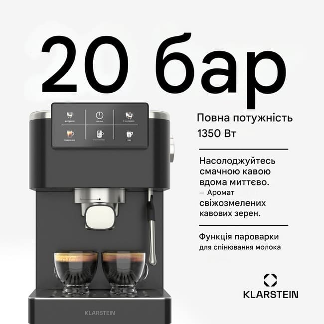 Кавоварка Klarstein SteelPresso Touch поєднує елегантний дизайн та найсучасніші технології для ідеального еспресо вдома. Завдяки потужності 1350 Вт та потужному насосу 20 бар вона забезпечує кремовий, ароматний еспресо якості бариста. SteelPresso Touch пропонує можливість приготування одного або двох напоїв одночасно — ідеально підходить для індивідуального задоволення або кавових посиденьок.
