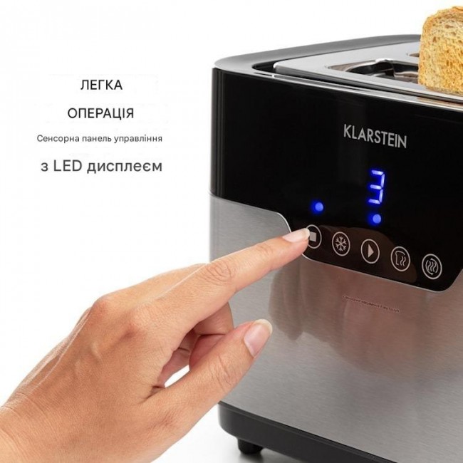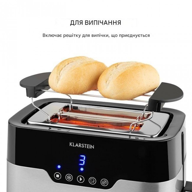 Завдяки потужній потужності 920 Вт тости та інші види хліба швидко підсмажуються та готові до вживання. Управління дуже просте: просто покладіть бажані скибочки хліба в тостер і виберіть рівень підсмажування та функцію на сенсорній панелі керування, світлодіодний дисплей чітко покаже відповідний вибір. Гнучкі металеві решітки адаптуються до товщини відповідного хліба та обережно транспортують його вниз. На додаток до семи регульованих рівнів підсмажування, тостер також пропонує функції розморожування, розігріву та скасування. Для випікання булочок доступна насадка, яку за потреби можна розмістити на тостері .