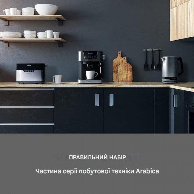 Завдяки знімному контейнеру для збору крихти легко видаляються. Корпус, який легко миється, виготовлений із шліфованої нержавіючої сталі та пластику, завдяки своєму простому та елегантному дизайну вписується в атмосферу кухні. Разом з кавомашиною та чайником із серії Arabica, тостер Arabica стане справжньою принадою для будь-якої кухні.