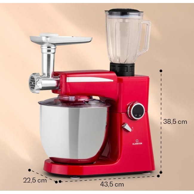 Один на все - розмір XL. Кухонний комбайн Klarstein Renata — потужне універсальне чудо для вашої кухні. Надзвичайно практичний, він поєднує в собі міксер, міксер і м'ясорубку в одному пристрої. Завдяки потужності 2000 Вт на 8 рівнях, планетарній системі змішування та гігантській 10-літровій чаші з нержавіючої сталі він може впоратися з усіма проблемами сучасного змішування, від важкого хлібного тіста до пухких збитих вершків. Ви можете приготувати свіжі смузі та смачні коктейлі в блендері об’ємом 1,5 л. А для любителів свіжого фаршу або макаронів ідеальним доповненням стане насадка для м’ясорубки з нержавіючої сталі. Вбудований цифровий дисплей із поворотною ручкою дозволяє легко регулювати швидкість і показує час роботи, щоб ви могли точно перемішувати. Барвистий дизайн вашого нового міксера Klarstein Renata 3-в-1 також є потужним . Це означає, що він буде зіркою на вашій кухні навіть після використання!