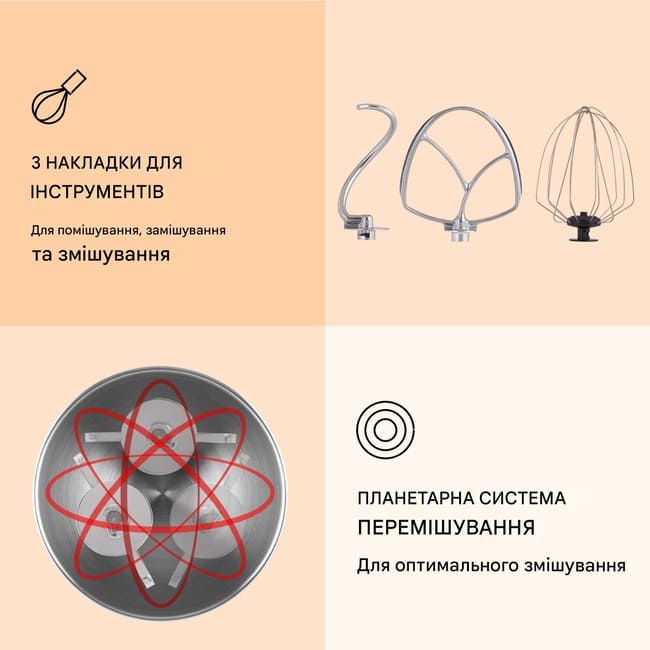 - 3 елементи для перемішування: гак для тіста/гачок для змішування/віночок