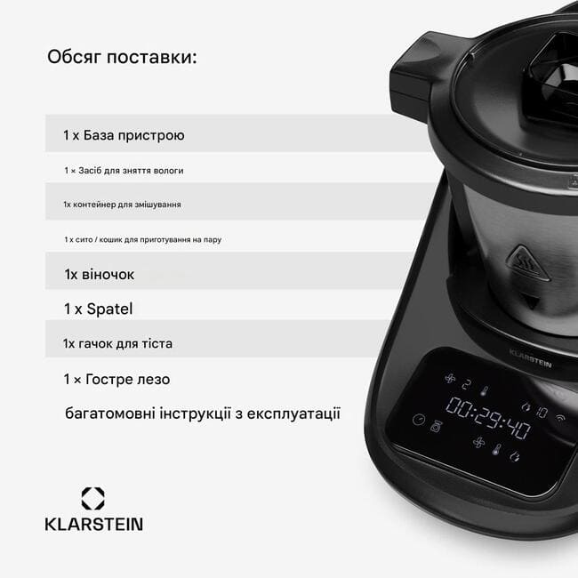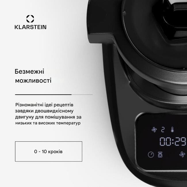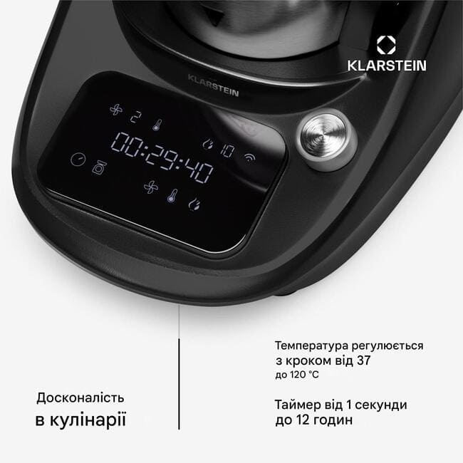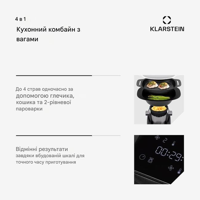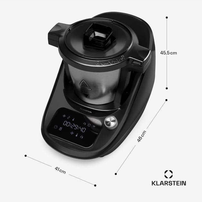 Один для всього: з кухонним комбайном Klarstein Aria Smart готувати стає так легко. Це багатофункціональне чудо приносить на вашу кухню 18 програм і 30 функцій: подрібнення, пюрування, змішування, замішування, варіння, приготування на пару, смаження та багато іншого. Його 3,3-літровий контейнер для змішування з нержавіючої сталі задовольняє майже всі потреби. І найкраща частина: ви можете легко керувати кухонним комбайном Klarstein Aria Smart за допомогою програми Klarstein із попередньо запрограмованими рецептами, яких слід дотримуватися крок за кроком. Або ви можете вибрати все самостійно; 10 швидкостей, температура від 37 до 120 °C і таймер від однієї секунди до 12 годин дають вам майже повну свободу приготування. Якщо цього недостатньо, ви можете готувати до 4 страв одночасно за допомогою 2-ступеневої насадки для варіння на пару та кошика. Потужність 1700 Вт може забезпечити необхідне тепло. Вбудовані ваги доповнюють усе за допомогою точно відміряних інгредієнтів.