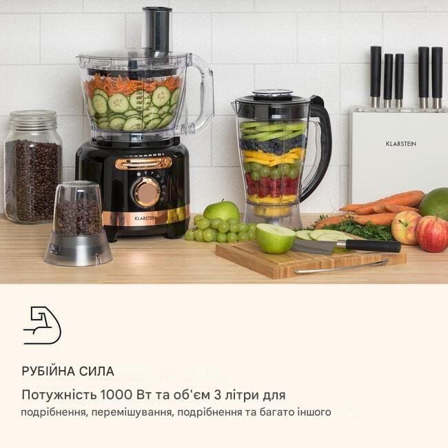 Єдиний для всього: багатофункціональний міксер Klarstein Luca потужністю 1000 Вт миттєво впорається з усіма завданнями на кухні - все, що вам потрібно зробити, це приготувати його самостійно, будь то подрібнення, нарізання, змішування, подрібнення, вичавлювання соку. , нарізання картоплі фрі, емульгування, кави. Подрібнення або подрібнення льоду, кухонний комбайн Klarstein Luca обов’язково виконуватиме правильну функцію завдяки 20 аксесуарам. З об’ємом 3 літри підставний міксер пропонує багато місця для тіста, смузі та соусів – навіть для сімейних порцій. Звичайно, усі пластикові деталі не містять бісфенолу А.