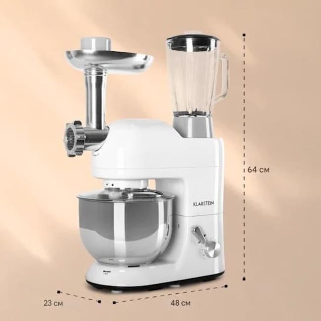 Один для всього. Кухонний комбайн Klarstein Lucia — це стильне універсальне диво для вашої кухні. Надзвичайно практичний, він поєднує в собі міксер, міксер і м'ясорубку в одному пристрої. Завдяки потужності 2000 Вт на 6 рівнях, планетарній системі змішування та чаші з нержавіючої сталі об’ємом 5,2 літра він відповідає всім вимогам сучасного змішування. Ви можете приготувати свіжі смузі та смачні коктейлі в блендері об’ємом 1,5 л. А для любителів свіжого фаршу або макаронів ідеальним доповненням стане насадка для м’ясорубки з нержавіючої сталі. Барвистий дизайн вашої нової Lucia також є потужним. Це означає, що він буде зіркою на вашій кухні навіть після використання!