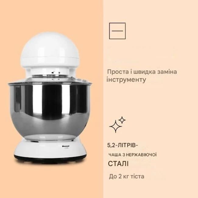 Поставляється з чашею з нержавіючої сталі об’ємом 5,2 літра, гаком і віночком для змішування, що складається з 3 частин.
