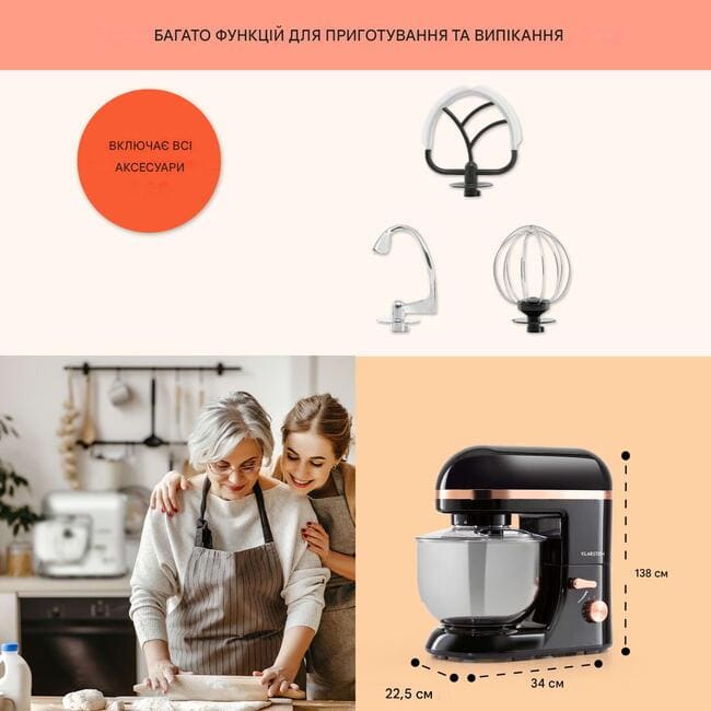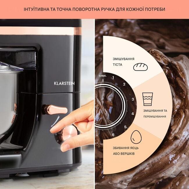 Елегантний аж до останньої революції та неймовірно міцний. Стати стильним на кухні легко з кухонними машинами Klarstein Bella Elegance. З потужністю 1800 Вт на 6 рівнях наша планетарна система змішування відповідає всім вимогам сучасного змішування. Хлібне тісто, збиті вершки чи мармуровий пиріг: ви можете ідеально перемішати все в чаші з нержавіючої сталі об’ємом 5,2 літра з 3 гачками для змішування. Барвистий дизайн вашої нової Bella Elegance також потужний, випромінюючи додатковий блиск за допомогою мідних або срібних додатків. Це означає, що він буде зіркою на вашій кухні навіть після використання!