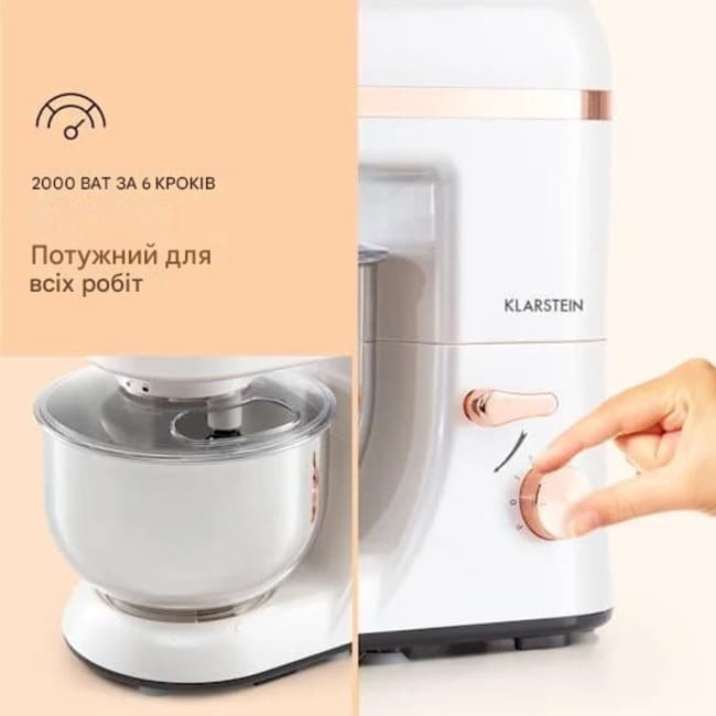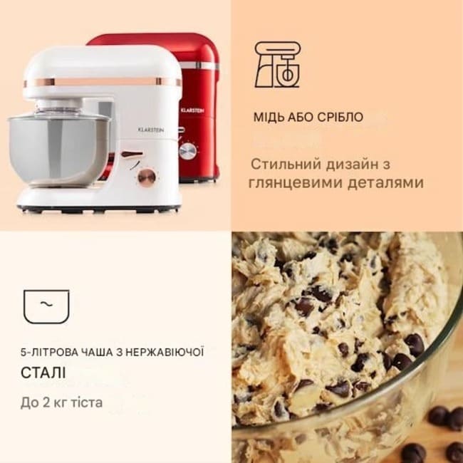 Елегантний аж до останньої революції та неймовірно міцний. Стати стильним на кухні легко з кухонними машинами Klarstein Bella Elegance. З потужністю 1800 Вт на 6 рівнях наша планетарна система змішування відповідає всім вимогам сучасного змішування. Хлібне тісто, збиті вершки чи мармуровий пиріг: ви можете ідеально перемішати все в чаші з нержавіючої сталі об’ємом 5,2 літра з 3 гачками для змішування. Барвистий дизайн вашої нової Bella Elegance також потужний, випромінюючи додатковий блиск за допомогою мідних або срібних додатків. Це означає, що він буде зіркою на вашій кухні навіть після використання!