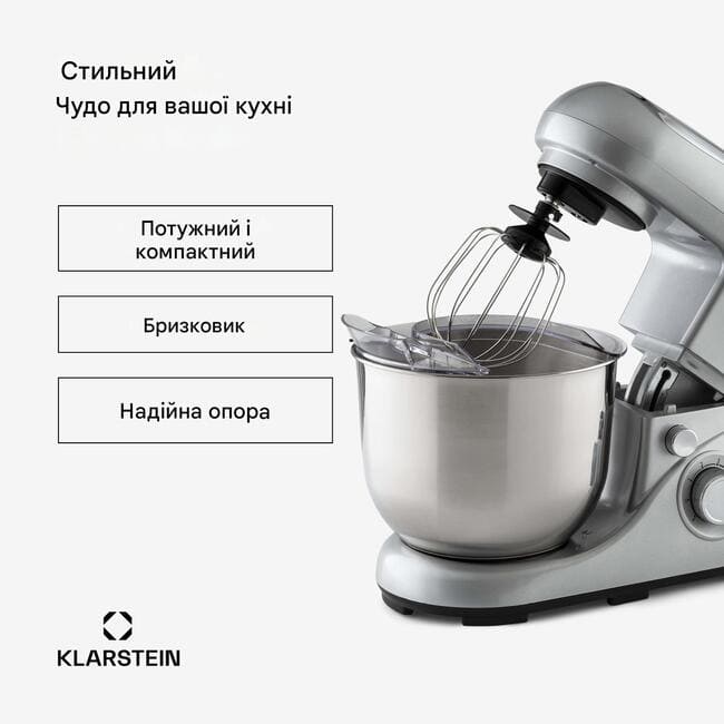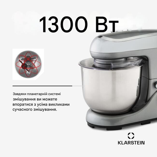 Потужний і компактний: стильний кухонний комбайн Klarstein Bella Pico 2G дуже легко перемішувати, замішувати або збивати . Завдяки 1300 Вт, 6 рівням потужності та нашій планетарній системі змішування ви зможете впоратися з усіма проблемами сучасного змішування. Усі інгредієнти ідеально змішуються в 5-літровій чаші з нержавіючої сталі. Компактні розміри та барвистий дизайн ідеально завершують загальну комплектацію.