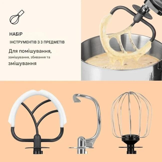 - 3 змішувальні елементи: гак для тіста, міксер і віночок