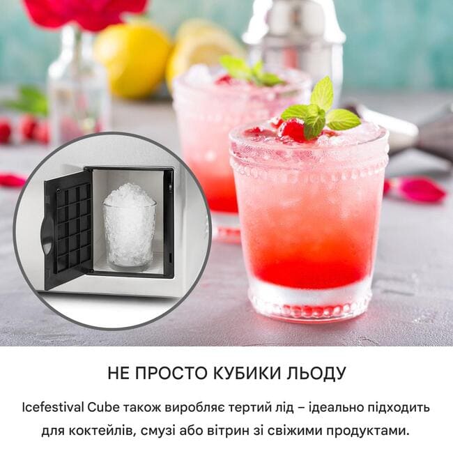 Його простий корпус із нержавіючої сталі легко інтегрується в бар або кухню, нечутливий та легко чиститься. До речі про очищення: Icefestival Cube також має автоматичну програму самоочищення.