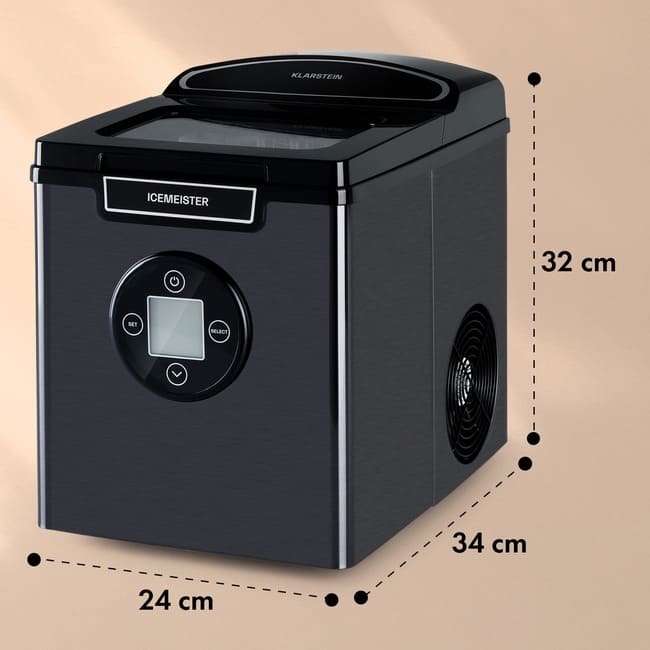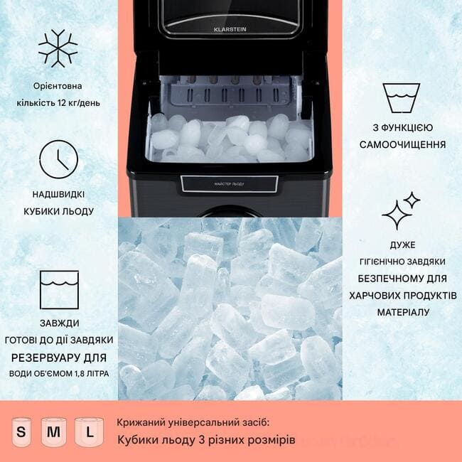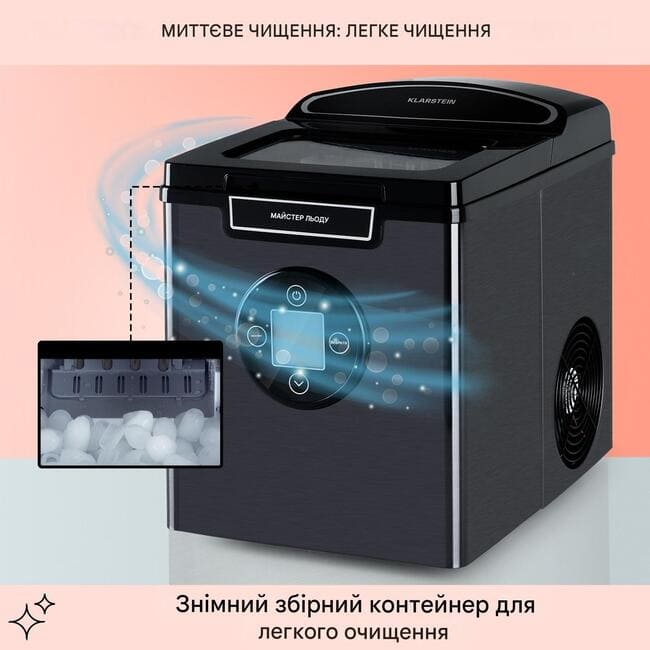 Цей льодогенератор Klarstein здатний виробляти до 12 кг льоду за 24 години, не потребуючи підключення до водопроводу. Для початку роботи достатньо наповнити резервуар водою об’ємом 1,8 л, обрати потрібний формат льоду та запустити цикл. Уже за кілька хвилин пристрій починає формувати перші кубики, що особливо зручно для швидкого охолодження напоїв.