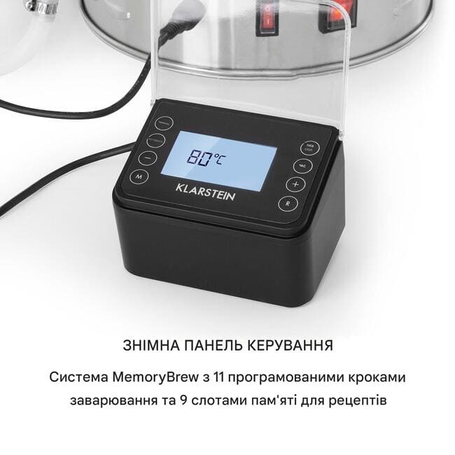 - Знімна панель керування: система MemoryBrew з 11 програмованими кроками приготування та 9 місцями для зберігання рецептів
