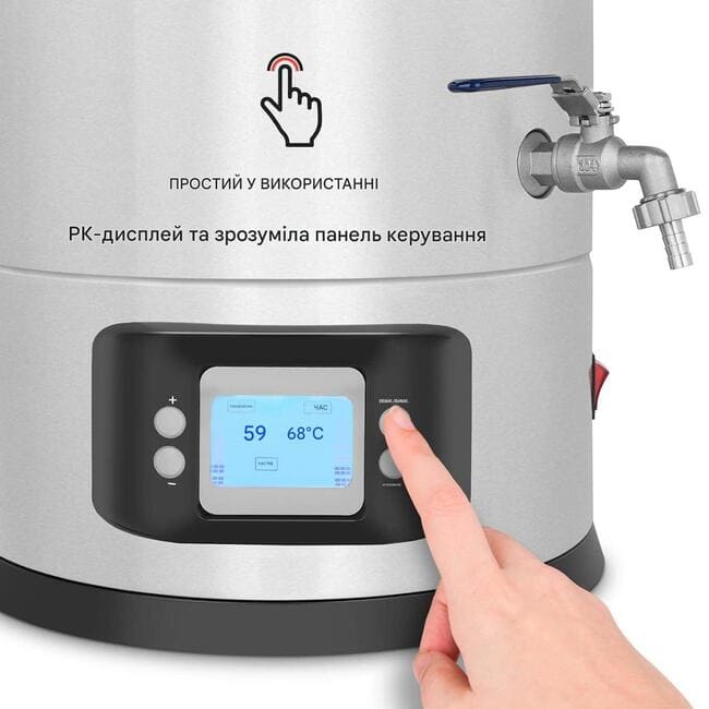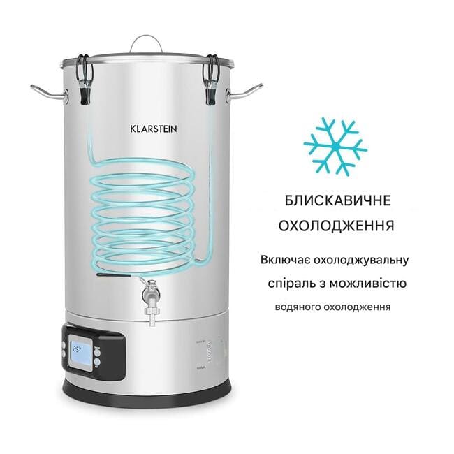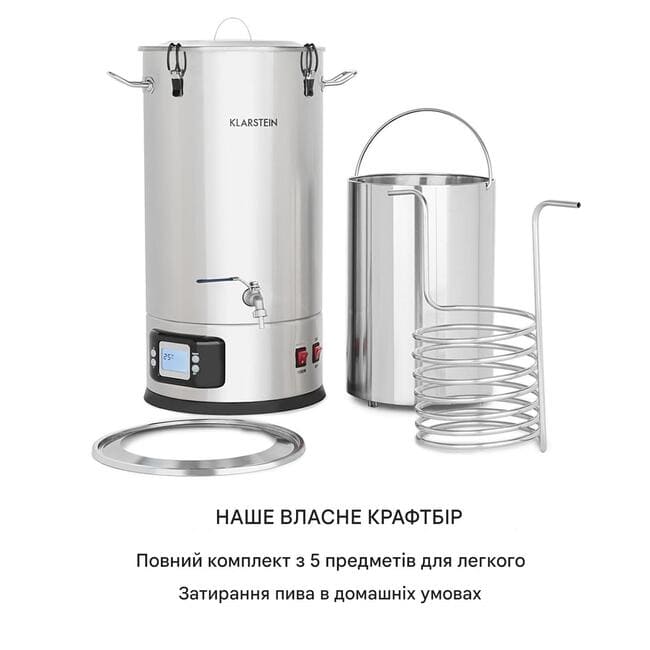Незалежно від того, початківець ви чи досвідчений пивовар, пивоварня Klarstein Mashfest пропонує простий повний пакет із 5 частин для приготування пива. У великому двостінному чайнику з нержавіючої сталі можна довести до кипіння до 35 літрів пивоварного матеріалу. Температуру, час приготування та потужність можна встановити вручну за допомогою зрозумілої панелі керування з РК-дисплеєм. Доступні два рівні потужності: 1500 Вт для підтримки тепла і 3000 Вт для кип'ятіння браги. РК-дисплей завжди точно показує, яка зараз температура.