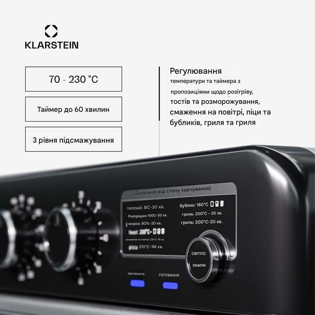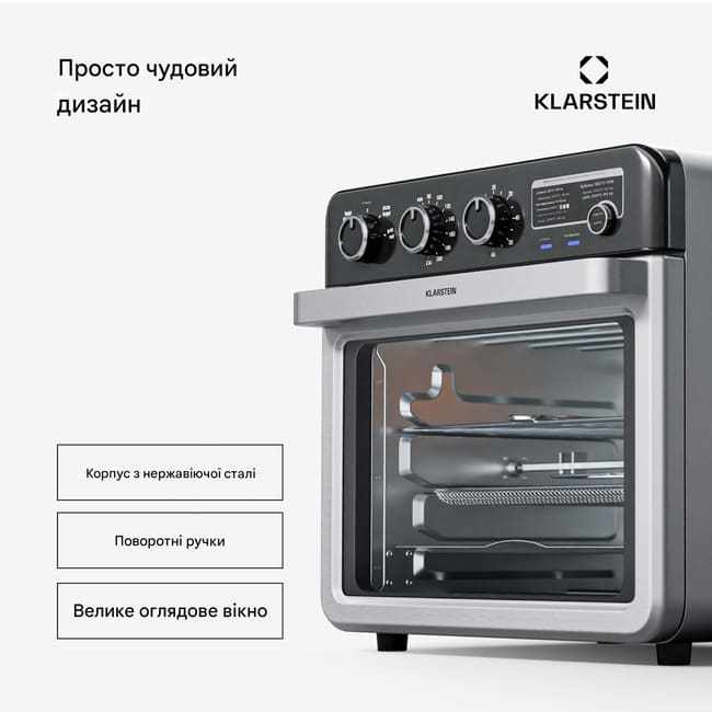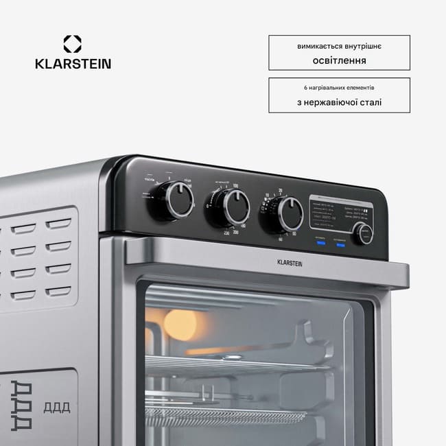 - Програми: смаження гарячим повітрям, підсмажування, вертел, гриль, випікання, бублик, піца, підігрів, розморожування