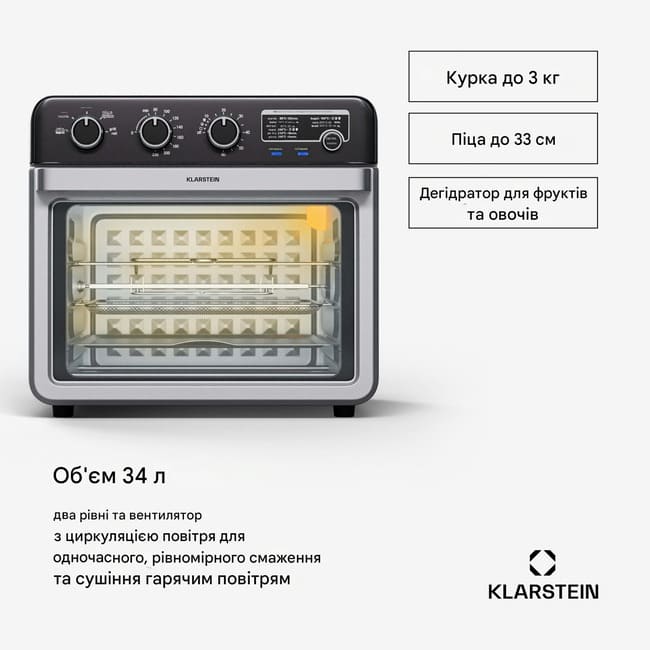 - Підходить для приготування курки вагою до 1,5 кг, піци діаметром до 33 см або 9 скибочок тосту