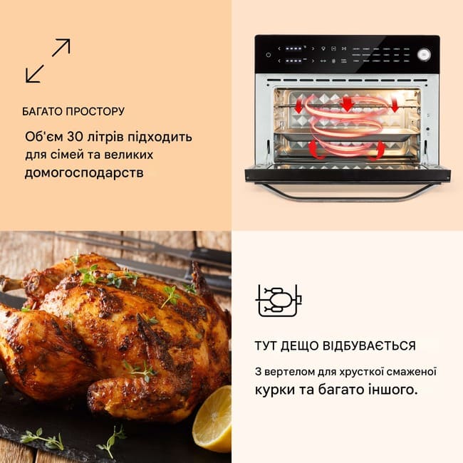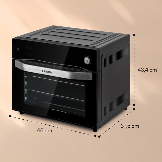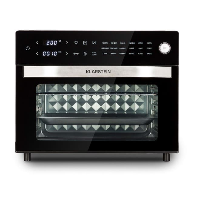 Смаження, випікання, гриль або смаження - усі ці функції не є проблемою для Vigor Air завдяки двом нагрівальним елементам (верхньому та нижньому). Завдяки 18 попередньо встановленим програмам і чіткій сенсорній панелі ви можете легко та зручно насолоджуватися численними смачними стравами. Завдяки об'єму в 30 літрів, привабливий пристрій дуже місткий і особливо підходить для сімей або великих домогосподарств. Такі спеціальні функції, як подвійне приготування та великий набір аксесуарів, не залишають бажати кращого.