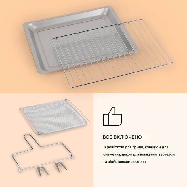 - Набір аксесуарів: решітка для гриля, кошик для смаження, деко, вертел і ручка для гриля.