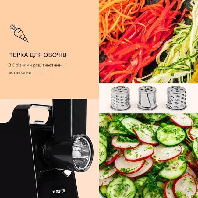 Дізнайтеся, що в ньому є: З електричною м'ясорубкою Mighty Mince від Klarstein ви можете самостійно приготувати всілякі ковбасні та м'ясні делікатеси. Цього досягають завдяки складній технології та простому й швидкому заповненню зверху. Помістіть відповідні інгредієнти у чашу-лійку та поступово проштовхуйте їх у трубку подачі за допомогою штовхача, що входить до комплекту, щоб вони сформувалися в головці леза та перфорованому диску. Ви можете не тільки приготувати чудовий фарш на домашній кухні, але й приготувати багато інших делікатесів завдяки широкому асортименту аксесуарів. Завдяки насадці-тертці з 3 різними лезами ви також можете дуже легко натерти овочі.