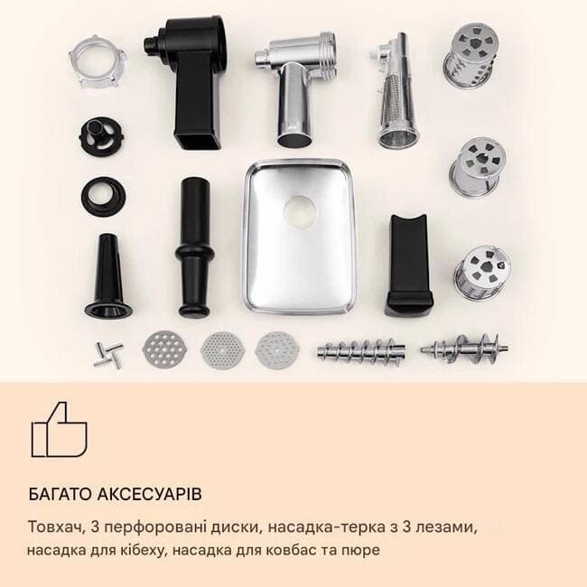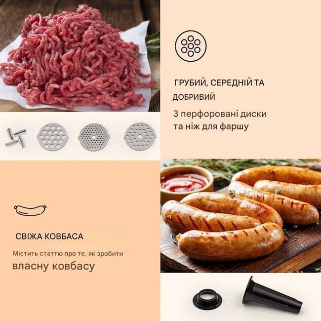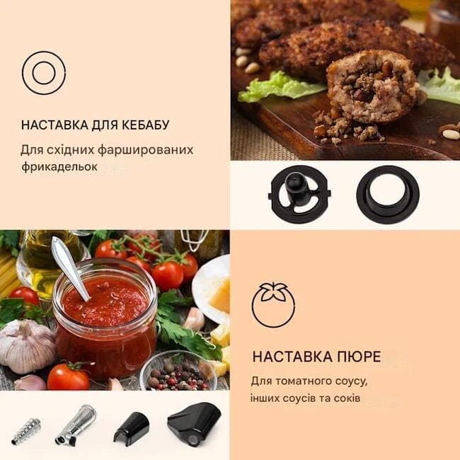 Для домашнього томатного соусу: Mighty Mince постачається з практичною насадкою-блендером для соків та соусів. І навіть якщо ви хочете приготувати власні вінерле або білі ковбаски, ця м’ясорубка ідеально підійде – вона постачається з насадкою для ковбас та насадкою для кеббе для фаршированого м’яса.