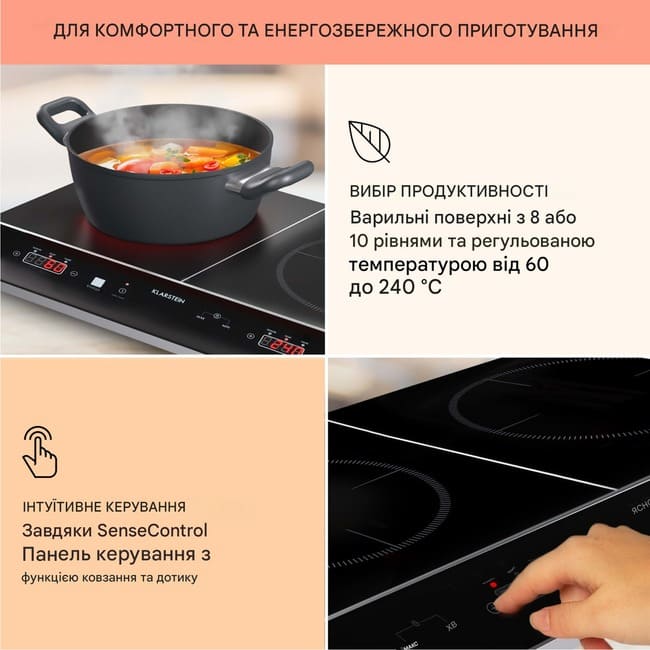 - Вибір потужності: кожна варильна панель має 6 рівнів і регульовану температуру від 60 до 240 °C.