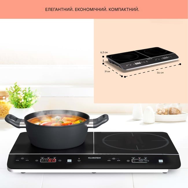 - Потужний нагрів: подвійна індукційна плита потужністю 3500 Вт із захистом від підвищеної і зниженої напруги.