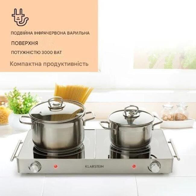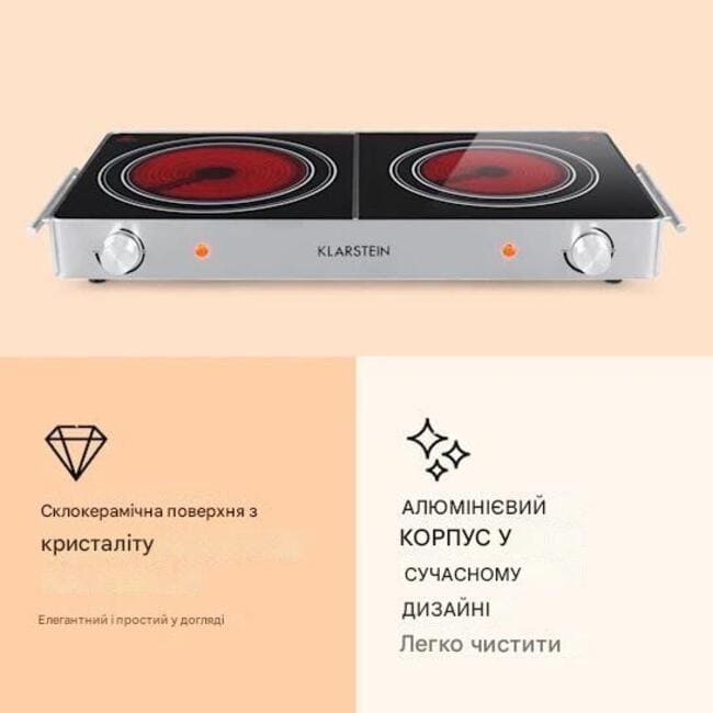 Практична та мобільна: конфорка Klarstein VariCook Duo підходить для найменшої кухні, швидко готова до використання та її можна легко транспортувати завдяки двом ручкам для перенесення збоку. Дві плити VariCook Duo швидко та енергозберігаючи нагрівають каструлі та сковорідки загальною потужністю 3000 Вт. Тепло від інфрачервоної конфорки рівномірно передається безпосередньо до посуду за допомогою галогенних радіаторів через пластину з кристалічного скла, стійку до подряпин.