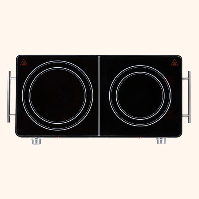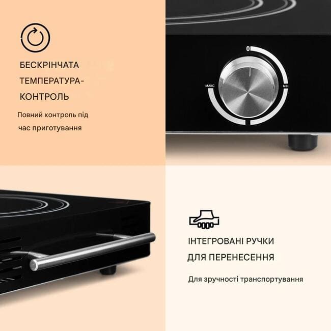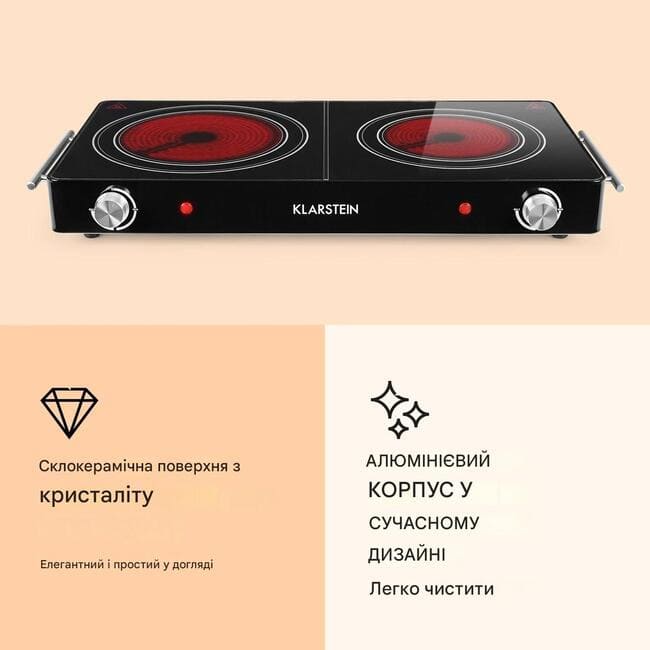 Практична та мобільна: конфорка Klarstein VariCook Duo підходить для найменшої кухні, швидко готова до використання та її можна легко транспортувати завдяки двом ручкам для перенесення збоку. Дві плити VariCook Duo швидко та енергозберігаючи нагрівають каструлі та сковорідки загальною потужністю 3000 Вт. Тепло від інфрачервоної конфорки рівномірно передається безпосередньо до посуду за допомогою галогенних радіаторів через пластину з кристалічного скла, стійку до подряпин.