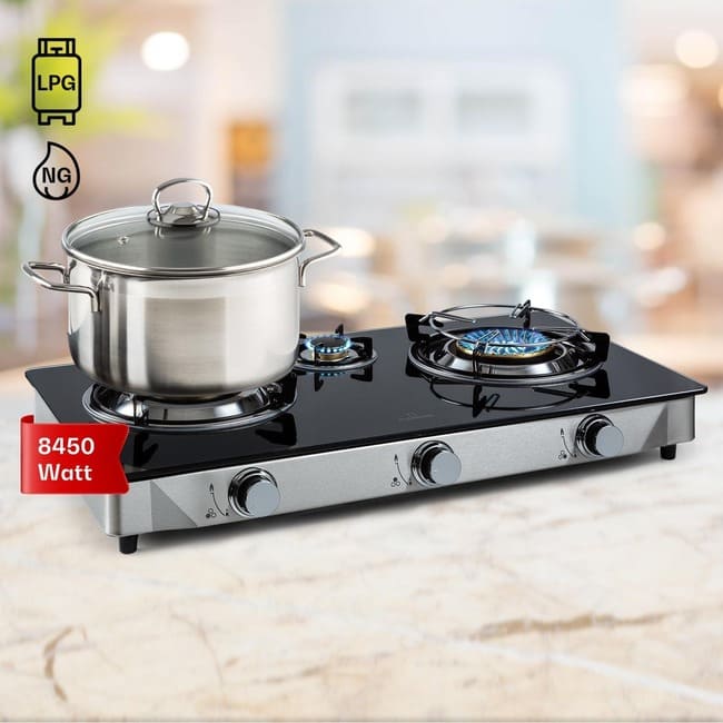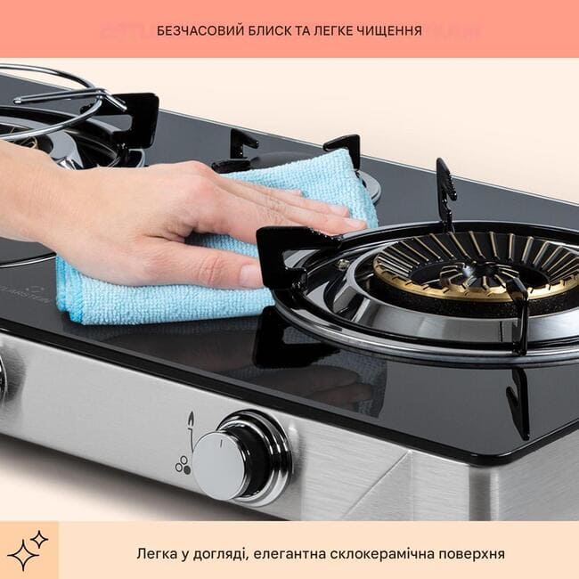 Варильною поверхнею легко керувати за допомогою двох плавних поворотних регуляторів і вбудованого п’єзорозпалу. Регулятори потужності з безперервним регулюванням забезпечують легке кипіння, а також швидке нагрівання та смаження. Після використання варильний пристрій миттєво очищається завдяки легкому в догляді поєднанню нержавіючої сталі та скляної поверхні. Завдяки своїм компактним розмірам газова варильна панель Klarstein Barzona 3 ідеально підходить як мобільний компаньйон у подорожах, наприклад, у походах або на літніх канікулах у сараї.