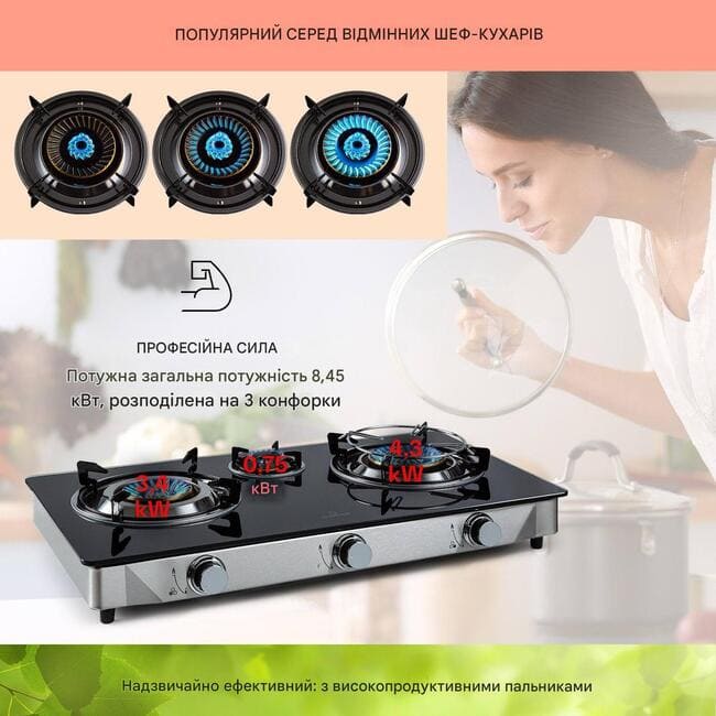 Газова плита Barzona 3 3 конфорки 3,4 / 0,75 / 4,3 кВт скло нерж.