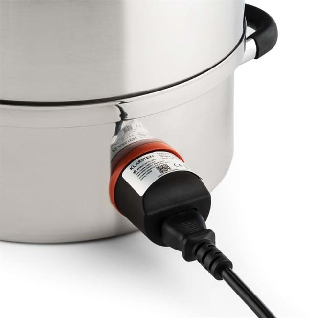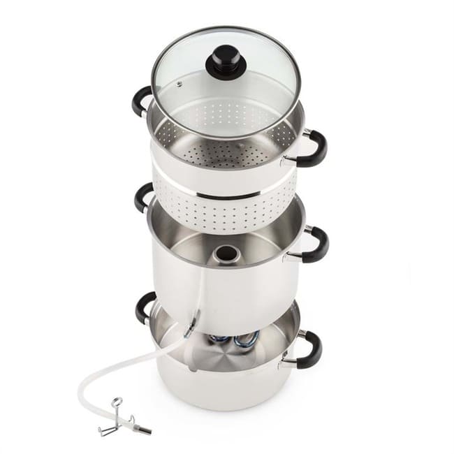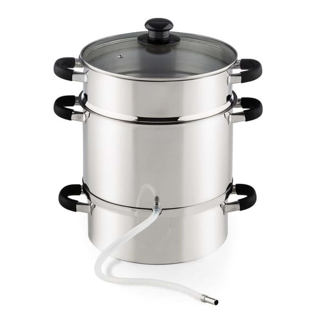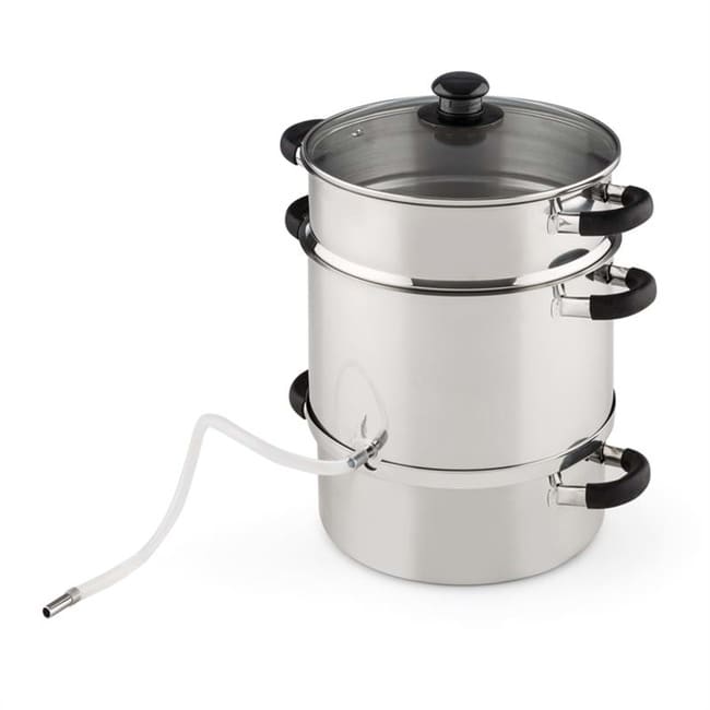 Відкрийте заново здорові соки! Парова соковижималка Klarstein Applebee робить це можливим. Лише найкращі інгредієнти потрапляють у сік і рівно стільки чи мало цукру, скільки вам подобається. Чи то для приготування власних фруктових соків тривалого зберігання, фруктових желе чи компотів чи як основа для найкращих лікерів, Applebee's завжди є правильним вибором. Його великий кошик має об’єм 8 літрів, що може забезпечити місце для приблизно 5 кілограмів фруктів, щоб вони пустили сік під час гарячої пари. Він наповнюється безпосередньо в пляшки за допомогою силіконової трубки, що входить до комплекту, і, на відміну від соків холодного віджиму, може зберігатися місяцями. Наявний хомут для шланга дуже спрощує заповнення. Особливою особливістю парової соковижималки Klarstein Applebee є вбудований електричний нагрівальний елемент потужністю 1500 Вт. Це означає, що він повністю не залежить від кухонної плити чи варильної панелі, тому його можна використовувати безпосередньо в саду для обробки врожаю фруктів на місці. Виготовлений повністю з нержавіючої сталі, сік не вбирає жодних сторонніх присмаків, а компоненти горщика можна легко очистити після використання, наприклад, у посудомийній машині.