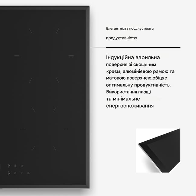 Індукційна варильна поверхня має матову поверхню для приготування їжі та глянцеві скошені краї з алюмінієвою рамкою. Вона також може похвалитися зручною магнітною системою керування для точного керування зонами приготування. Усі чотири зони приготування оснащені потужною функцією boost, яка значно скорочує час приготування. Індикатор залишкового тепла попереджає про гарячі поверхні, забезпечуючи додаткову безпеку після приготування. Функція таймера дозволяє встановлювати час приготування для кожної страви окремо.