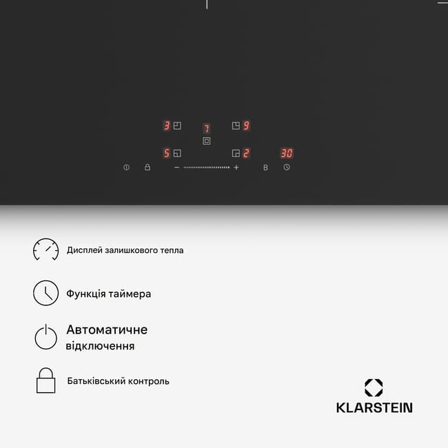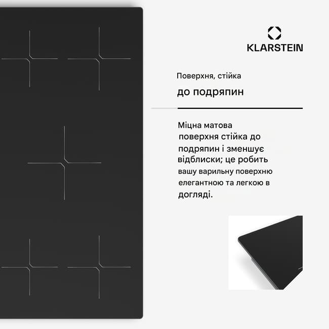 Індукційна варильна поверхня Klarstein PowerGlide поєднує в собі привабливий сучасний дизайн та потужну продуктивність. Вона виготовлена з високоякісних і міцних матеріалів, а елегантна матова скляна поверхня, стійка до подряпин, легко миється.