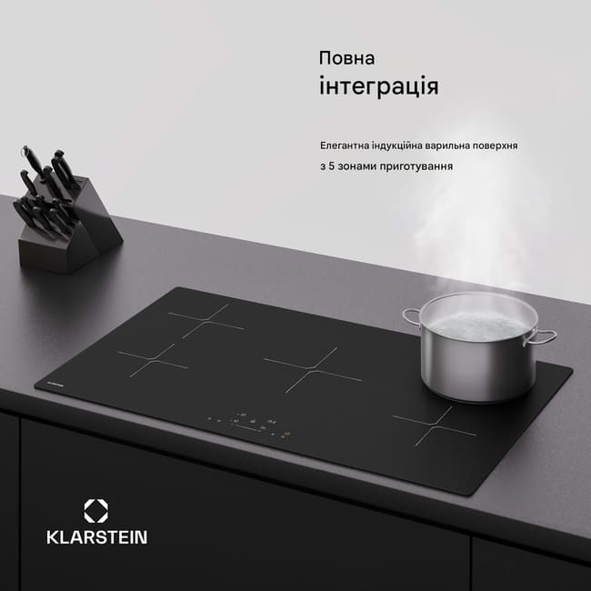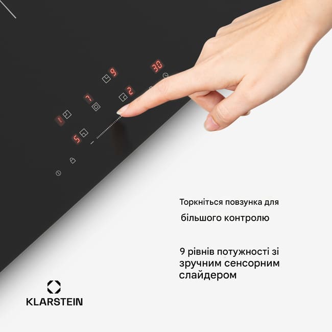 П’ять потужних і високоякісних індукційних конфорок із загальною потужністю до 9800 Вт у режимі Boost гарантують комфортне приготування їжі. Варильна поверхня проста та інтуїтивно зрозуміла у використанні завдяки сенсорному слайдерному керуванню. Безпечне використання забезпечують блокування від дітей та індикатор залишкового тепла.