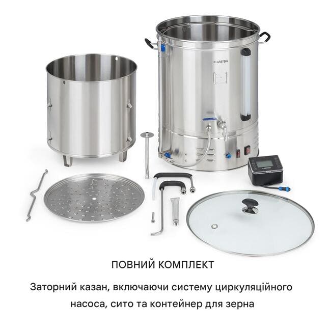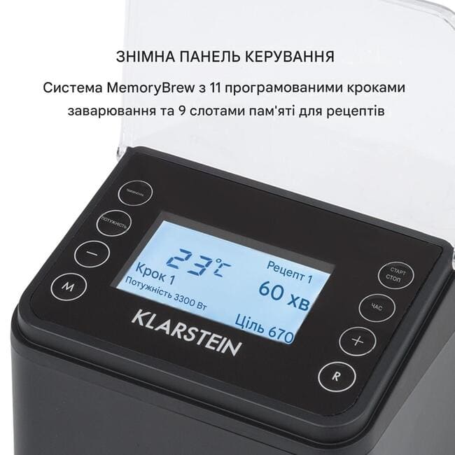 Будь то новачок або досвідчений пивовар-любитель, Klarstein brewing hero Pro mash котел пропонує простий повний пакет для приготування пивоварного сусла. Температуру, час приготування і потужність можна точно встановити з допомогою чіткої панелі керування з РК-дисплеєм. Наша перевірена система MemoryBrew виявляється тут особливо практичною.: Просто запрограмуйте і збережіть до 11 етапів заварювання. 9 комірок пам'яті рецептів дозволяють варіювати процеси пивоваріння. Швидкі закуски використовують один з чотирьох збережених рецептів легкого або повнотілої, табірного або пшеничного пива. Блок управління гнучко підключається до заварочному котла кабелем і тому легко знімається.
