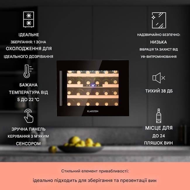 Vinsider 24 Onyx Випуск охолоджувач вина з Klarstein переосмислює класичний винний льох: у привабливо елегантний дизайн виготовлений зі сталі, скла та дерева. Завдяки перемикному світлодіодному внутрішньому освітленню ваше вино завжди непомітне та вміло привертає увагу. Отже, ви можете насолоджуватися виглядом обраної вами колекції вин щоразу, коли заходите на кухню. Не дивно, що ваші гості кидають зависотливі погляди на вашу винну колекцію, адже такий холодильник для вина хотілося б мати кожному!