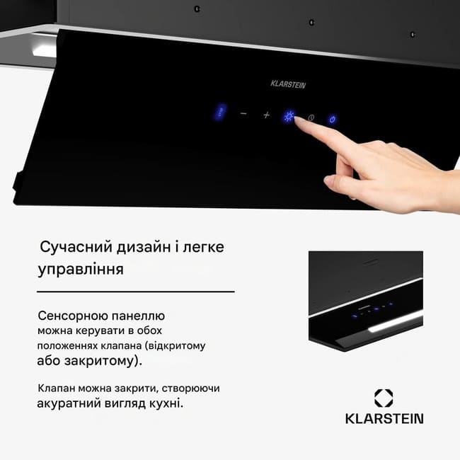 Сучасна витяжка Ventimate від Klarstein оснащена новою сенсорною панеллю керування, розташованою на зручному крилі, яке можна відкривати та закривати за потреби. Завдяки високопродуктивному двигуну постійного струму вона забезпечує швидкість потоку повітря 390 м³/год з мінімальним шумом. Витяжка пропонує три рівні потужності та може використовуватися як у режимі канального, так і в режимі рециркуляції – вбудований вугільний фільтр забезпечує додаткову гнучкість. Завдяки класу енергоефективності A+ витяжка Ventimate ефективно та економічно очищає повітря.