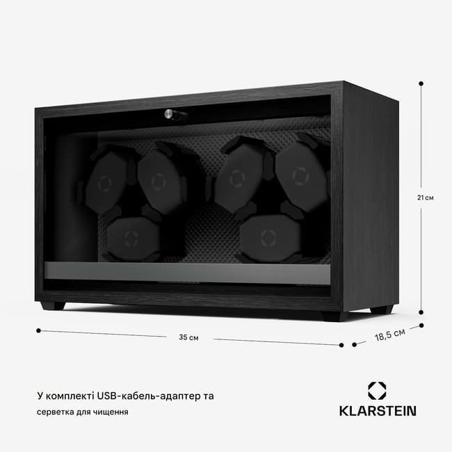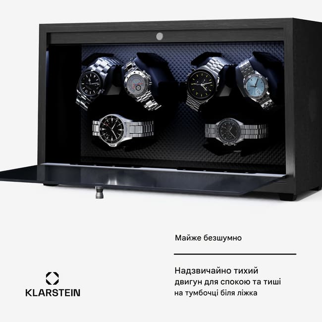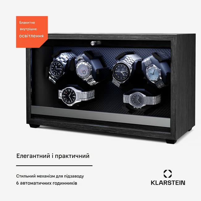 Ідеально виконана точність виконання! З підзаводом годинника Klarstein Brienz 6 ваші елегантні супутники завжди готові до використання та добре доглянуті. Автоматичні годинники, що зберігаються в пристрої, безперервно заводяться за допомогою чотирьох режимів обертання, які імітують рух зап'ястя. Обертання також сприяє підтримці руху, оскільки ефективно протидіє осмолюванню масляного мастила. Годинниковий механізм Brienz 6 вражає своїм елегантним корпусом під дерево, який стильно вписується в будь-який інтер'єр кімнати. Просте та інтуїтивно зрозуміле керування також дозволяє налаштувати стильне вбудоване синє світлодіодне підсвічування. Праворуч розташована практична поворотна ручка для налаштування потрібного режиму. Завдяки вбудованій подушечці з піни з ефектом пам'яті, годинники різного розміру ремінця, а також чоловічі та жіночі годинники можна легко вставити в штурвал на 6 годинників . Живлення подається через USB-кабель, який можна використовувати з будь-яким USB-адаптером живлення, і тому він повністю не залежить від переважного типу розетки.