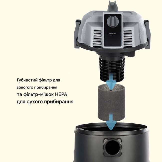 - Глибока очистка: губчастий фільтр для вологого прибирання і фільтр-мішки HEPA для сухого прибирання