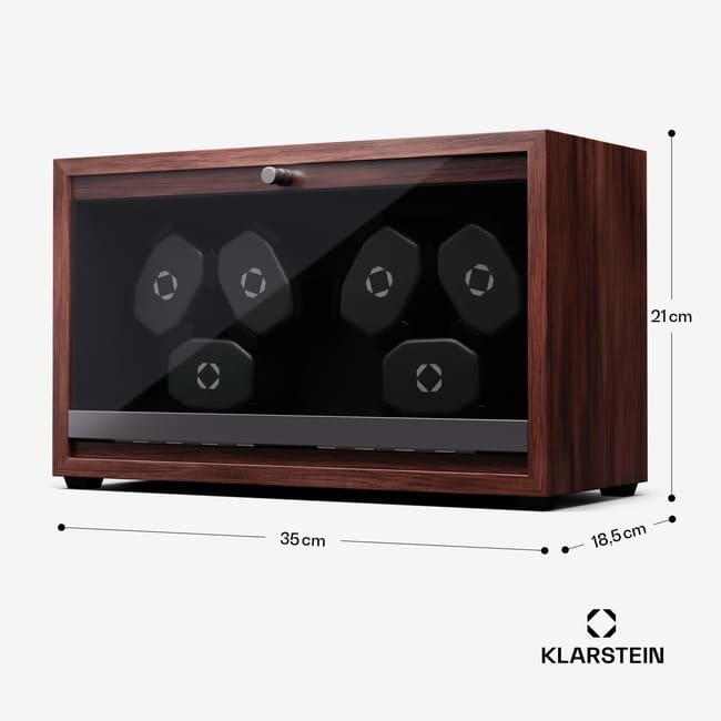 Ідеально виконана точність виконання! З підзаводом годинника Klarstein Brienz 6 ваші елегантні супутники завжди готові до використання та добре доглянуті. Автоматичні годинники, що зберігаються в пристрої, безперервно заводяться за допомогою чотирьох режимів обертання, які імітують рух зап'ястя. Обертання також сприяє підтримці руху, оскільки ефективно протидіє осмолюванню масляного мастила. Годинниковий механізм Brienz 6 вражає своїм елегантним корпусом під дерево, який стильно вписується в будь-який інтер'єр кімнати. Просте та інтуїтивно зрозуміле керування також дозволяє налаштувати стильне вбудоване синє світлодіодне підсвічування. Праворуч розташована практична поворотна ручка для налаштування потрібного режиму. Завдяки вбудованій подушечці з піни з ефектом пам'яті, годинники різного розміру ремінця, а також чоловічі та жіночі годинники можна легко вставити в штурвал на 6 годинників . Живлення подається через USB-кабель, який можна використовувати з будь-яким USB-адаптером живлення, і тому він повністю не залежить від переважного типу розетки.