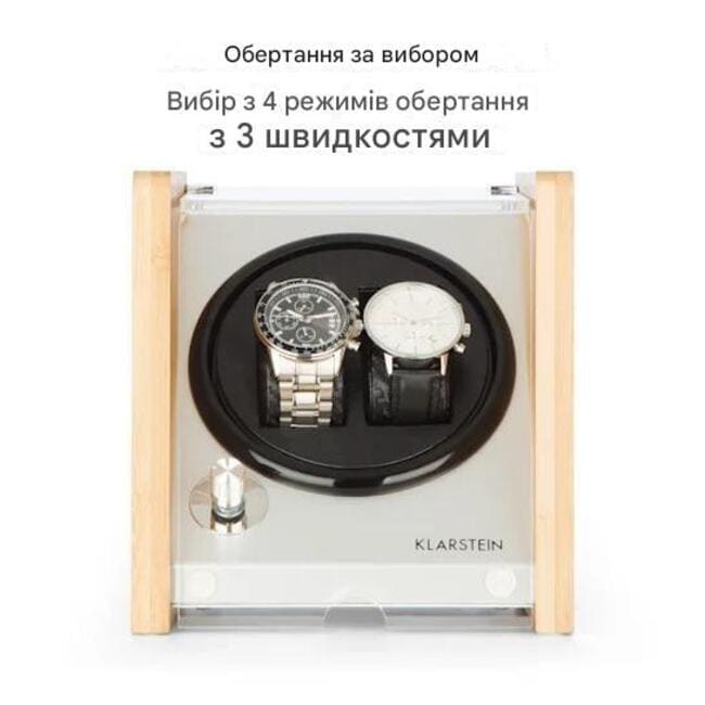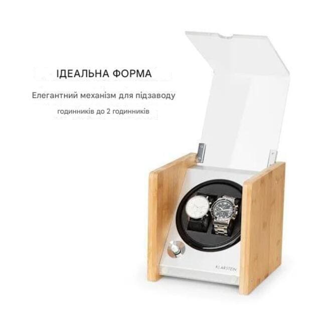 Тут справа в бездоганній точності виконання! З механізмом заводу для годинника Klarstein Hanoi 2 ваші елегантні компаньйони готові до використання в будь-який час і в належному стані. Автоматичні годинники, що зберігаються в пристрої, безперервно заводяться за допомогою 4 режимів обертання та 3 різних швидкостей, які імітують рух зап’ястя. Обертання також сприяє догляду за механізмом годинника, ефективно протидіючи склеюванню масляного плями. Механізм заводу годинника Hanoi 2 вражає елегантним бамбуковим корпусом , який стильно вписується в будь-яку кімнату. Поверхня управління, виготовлена з шліфованого алюмінію, надає конструкції безпомилкового блиску, а велике оглядове вікно з акрилового скла, яке можна дивитися зверху та спереду, забезпечує безперешкодний огляд автоматичних годинників.