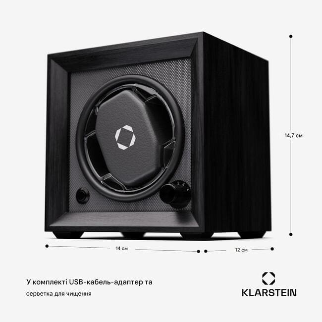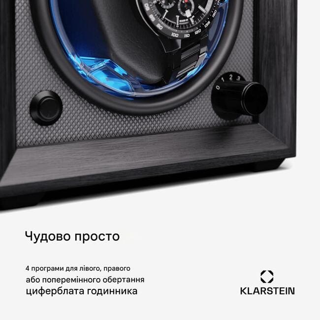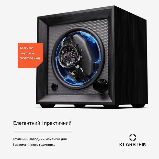 З заводним механізмом для годинника Klarstein Brienz 1 ваші елегантні компаньйони готові до використання в будь-який час і в належному стані. Автоматичні годинники, що зберігаються в пристрої, постійно заводяться за допомогою 4 режимів обертання, які імітують рух зап'ястя. Обертання також сприяє догляду за годинниковим механізмом, оскільки воно ефективно протидіє склеюванню масляного плями. Механізм заводу годинника Brienz 1 вражає елегантним дерев’яним корпусом , який стильно вписується в будь-яку кімнату. Стильне вбудоване синє світлодіодне освітлення також можна регулювати за допомогою простої та інтуїтивно зрозумілої операції. Праворуч знаходиться практична поворотна ручка для налаштування потрібного режиму. Завдяки вбудованій подушці з піни з ефектом пам’яті годинники різних розмірів браслета, а також жіночі та чоловічі годинники можна легко використовувати в заводі. Живлення подається через USB-кабель, який можна використовувати з будь-яким джерелом живлення USB і тому повністю не залежить від переважного типу розетки.