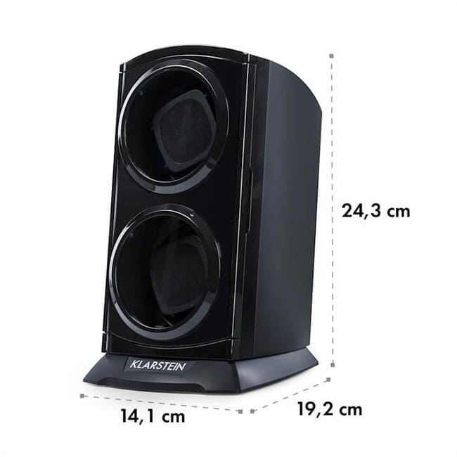 Пристрій для заводу годинників Klarstein St. Gallen Premium допоможе вам зберегти та привабливо представити ваші автоматичні годинники. Два хронографи одночасно розміщені на двох поворотних столиках і обертаються, щоб механізми працювали безперервно, навіть якщо їх не носити. При цьому годинники оформлені стильно. Завдяки чотирьом вибраним швидкостям обертання та окремому регулюванню напрямку ходу ви можете оптимально адаптувати механізм до своїх годинників. Автоматичні годинники хочуть і повинні бачити! Елегантний дизайн заводу годинника Klarstein St. Gallen Premium враховує це. Його корпус із ударостійкого пластику забезпечує найкращий огляд годинника з двома оглядовими віконцями з акрилового скла. Синє світлодіодне освітлення забезпечує правильний освітлення.