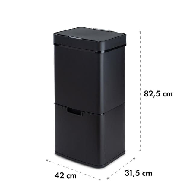 Зі своїм просторим 72-літровим внутрішнім простором, Klarstein Royal Trash пропонує великий 43-літровий бак для сміттєвих пакетів та два 12,5-літрові контейнери для переробки. Це дозволяє розділяти великогабаритні відходи, звичайні відходи та папір безпосередньо після утилізації. Інтегроване 4-літрове відро для органічних відходів особливо практичне та має кришку для додаткового контролю запаху. Наповнення верхнього баку відбувається повністю безконтактно: датчик кришки автоматично відкриває бак, щойно ви наближаєтесь приблизно на 20 см до радіуса дії датчика. Через п'ять секунд після викидання відходів кришка автоматично закривається. За потреби кришку також можна відкривати та закривати вручну натисканням кнопки. Два 12,5-літрові контейнери для переробки розміщені в шухляді на роликових підшипниках і рухаються вперед і назад простим натисканням ручки. Royal Trash Matte Black також візуально привабливий; його гладкий корпус з нержавіючої сталі не тільки елегантний, але й стійкий до відбитків пальців. Індикаторні лампи на панелі керування надійно відображають стан датчика та рівень заряду батареї, а механізм SoftClose Lid забезпечує особливо тихе відкривання та закривання. Контейнер для залишкових відходів сенсорного контейнера Klarstein також оснащений затискним кільцем, яке фіксує вкладиш для контейнера.