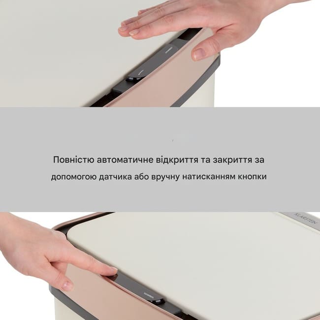 Завдяки об’ємному внутрішньому об’єму 72 літри Klarstein Royal Trash пропонує великий сміттєвий контейнер об’ємом 43 літри, а також 2 х 12,5-літрові контейнери для переробки. Наприклад, великогабаритні відходи вторинної переробки, залишки відходів і папір можна розділяти відразу після їх викидання. Прикріплене 4-літрове відро є особливо практичним, в яке можна утилізувати органічні відходи та має додатковий захист від запаху завдяки кришці. Наповнення верхнього сміттєвого контейнера відбувається абсолютно безконтактно: завдяки датчику кришки вона відкривається повністю автоматично, щойно ви підходите в зону дії датчика близько 20 см. Через 5 секунд після викидання сміття кришка знову автоматично закривається. Якщо необхідно, кришку також можна відкрити та знову закрити натисканням кнопки. Контейнери для переробки 2 x 12,5 л розташовані в шухляді з роликовим підшипником і пересуваються вперед і назад за допомогою ручки. Royal Trash Rose Gold також вражає візуально; його гладкий корпус із нержавіючої сталі не тільки елегантний, але й стійкий до відбитків пальців. Світлові індикатори на панелі керування також надають достовірну інформацію про стан датчика та рівень заповнення вставлених батарей, а механізм кришки SoftClose забезпечує особливо тихе відкривання та закривання. Контейнер для залишків відходів сенсорного відра для сміття Klarstein також оснащений прикріпленим затискним кільцем, яке забезпечує надійне утримання мішка для сміття.