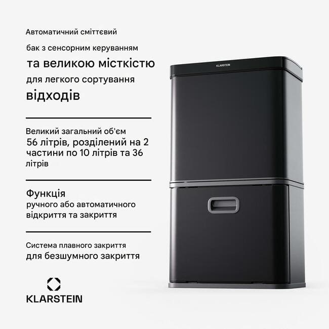 Що робить сміттєвий бак Klarstein Touchless Sensor унікальним, так це його здатність розділяти відходи. Завдяки трьом окремим відділенням ви можете сортувати та переробляти сміття. Ємність відсіків становить 36 літрів, 10 літрів і додаткові 10 літрів, що дозволяє розділяти різні види відходів.