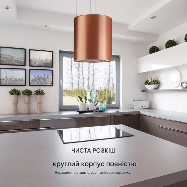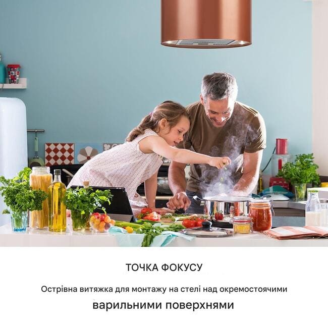 - Фокус: острівна витяжка для кухонних зон, що окремо стоять.